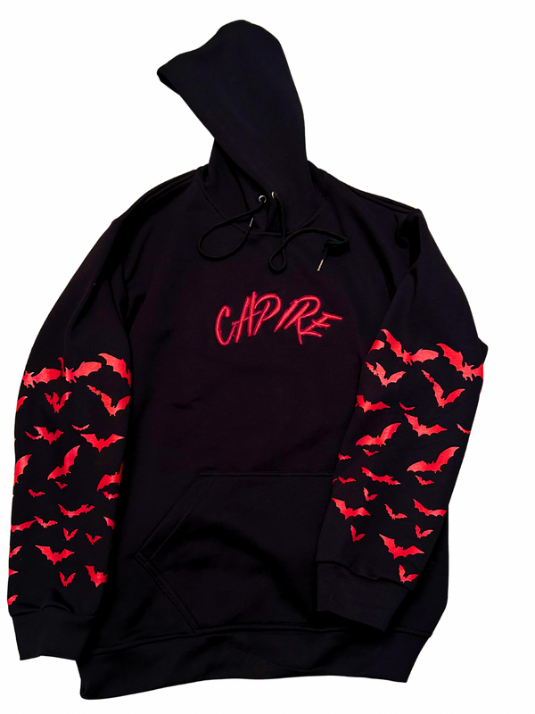 Stay stylish and warm with the Capire 'Red Nights' Hoodie. This vibrant red hoodie features unique bat designs on the arm sleeves and expertly stitched 'capire' branding on the chest. Made with high-quality materials, this hoodie is sure to make a statement while keeping you cozy.